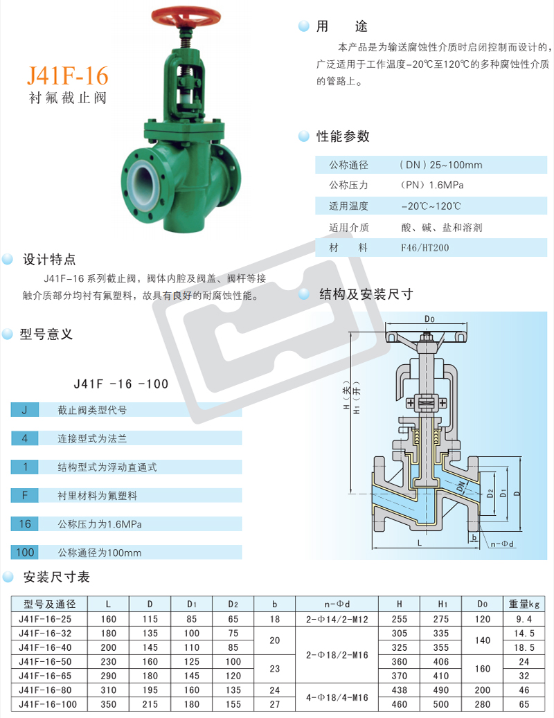 J41F-16系列襯氟截止閥,閥體內(nèi)腔及閥蓋、閥桿等接觸介質(zhì)部分均襯有氟塑料合金,故具有耐腐蝕性能。